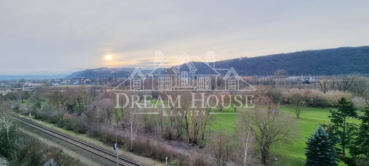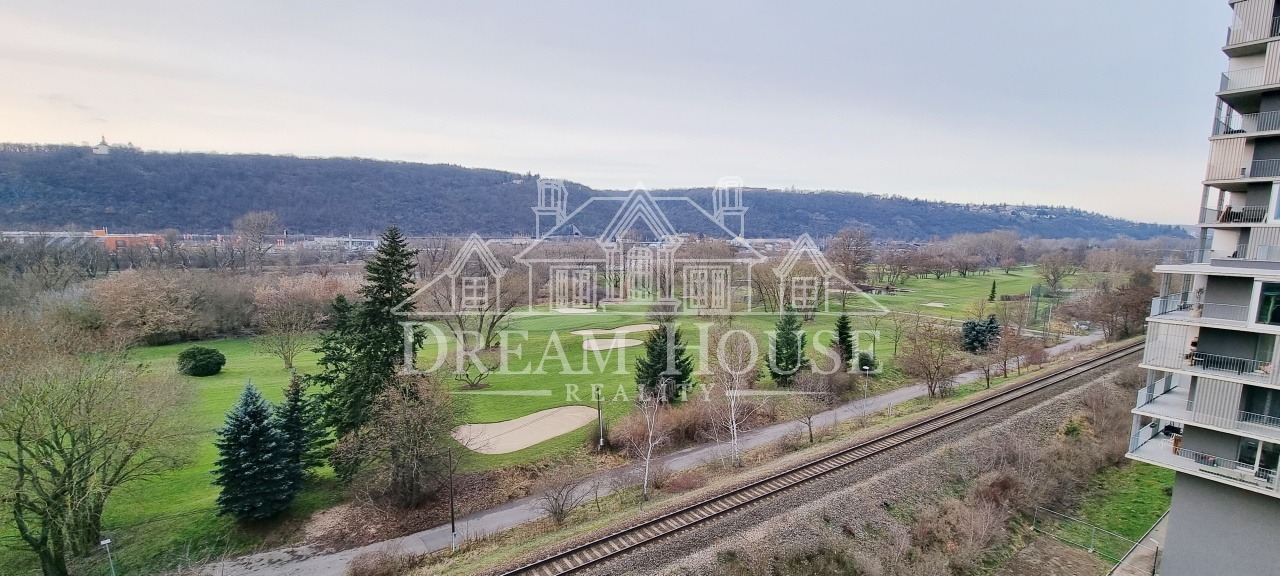 Orientace bytu na západ (okna ložnic) a sever (hlavní obytná místnost s kuch. koutem a terasou), s krásným výhledem na Vltavu či sousedící golfové hřiště.