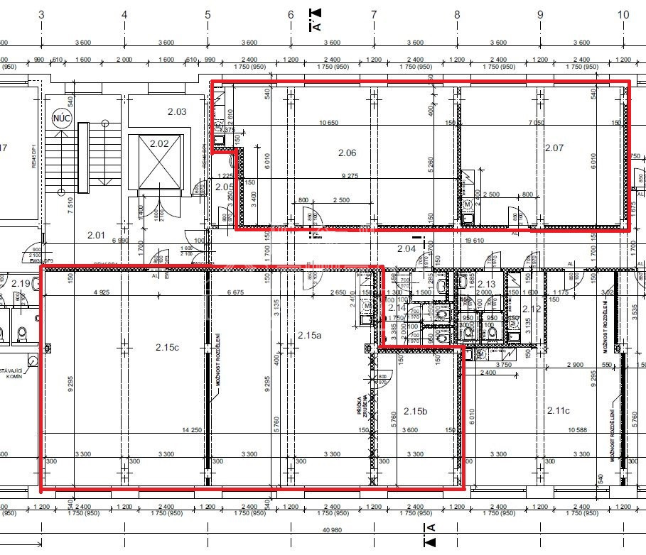 Kancelářské prostory (s ozn. A12/2.15 a 2.06+2.07) se skládají z 2 větších souborů kanceláří (152,27m2 a 101,11m2), které jsou klimatizovány a vybaveny vlastními kuch. kouty. Podlahové krytiny tvoří zátěžové koberce. Kanceláře se pronajímají jako nezařízené.