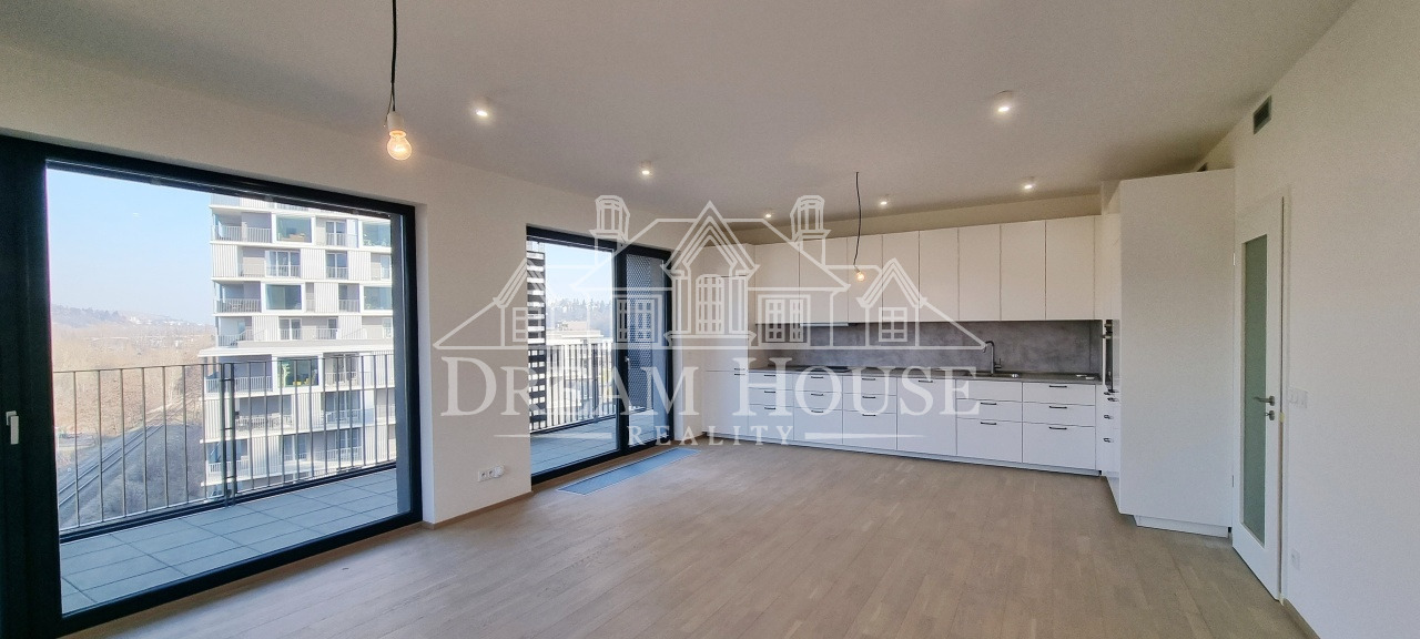 Dovolujeme si Vám nabídnout k pronájmu slunnou novostavbu bytu 3+kk s terasou/lodžií (14m2), o celkové ploše 106m2, situovanou v 5. patře novostavby (z r. 2022) Rezidence Moje Zahálka na Praze 12 - Modřanech (ul. Mezi Vodami).