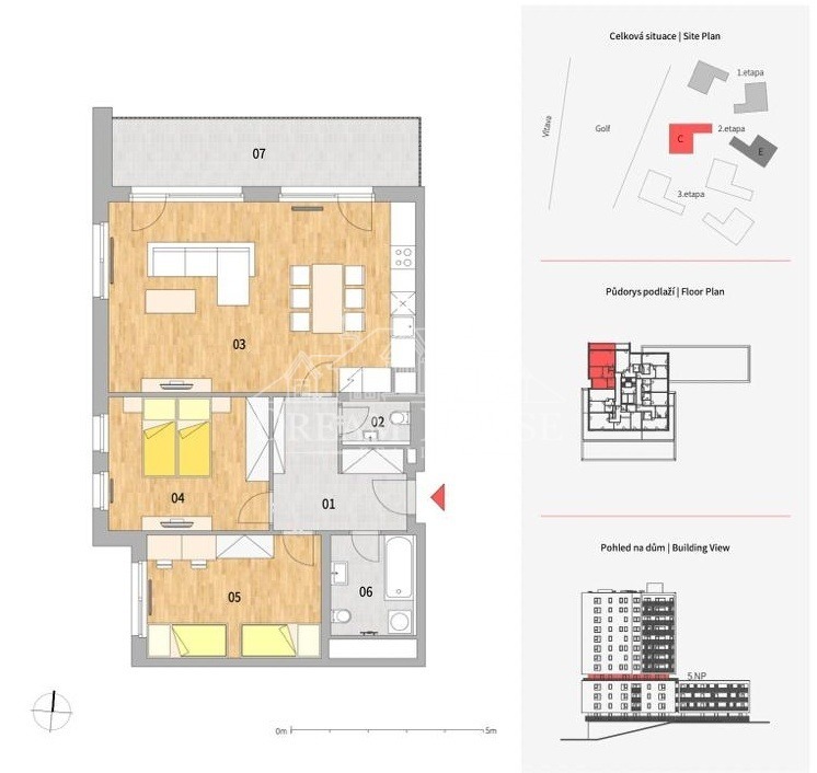 Orientace bytu na západ (okna ložnic) a sever (hlavní obytná místnost s kuch. koutem a terasou), s krásným výhledem na Vltavu či sousedící golfové hřiště.